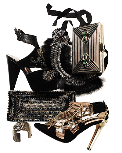 SHOP THE LOOK: (top to bottom) Rabbit fur and glass bead necklace, Sachin + Babi for Ankasa, $260; 212-966-3626. Metal clutch with crystals and semiprecious stones, Judith Leiber, $1,995; at judithleiber.com. Suede and leather beaded platform sandals, Donald J Pliner, $400; at donaldjpliner.com. Silk and crystal clutch, Moyna, $250; at moynabags.com. Suede, lizard and stingray sandals, Chrissie Morris, $1,120; 212-753-4000. Oxidized silver, Swarovski crystal and oxidized gold-leaf cuff, Soo Ihn Kim, $165; 212-675-6693.